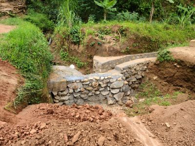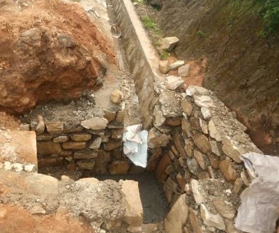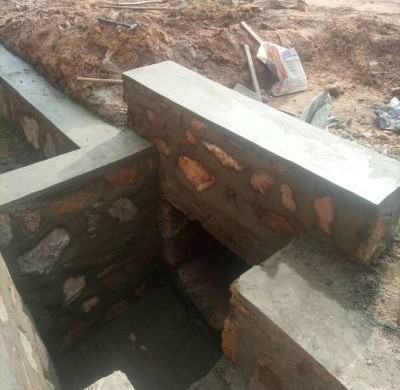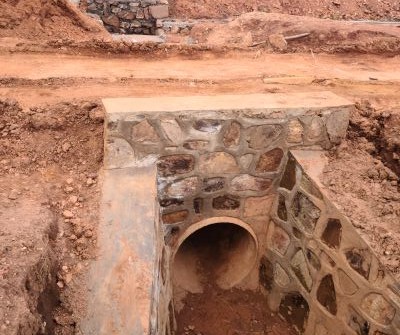 au PK 21+300 Travaux de maçonnerie en moellons de l'ouvrage de traversé sont achevés tandis que le remblai est en cours
