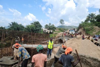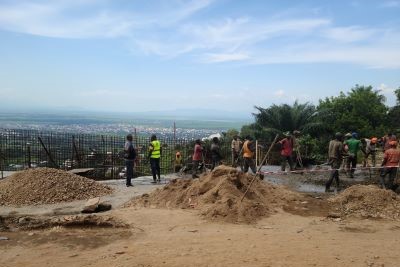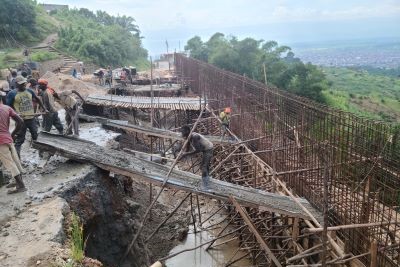 Traitement d'un point critique à la RN1 au PK9.Travaux en cours: bétonnage de la voile partie inférieure pour la construction d'un mur de soutènement.
