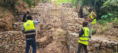 Les travaux de stabilisation du ravin par un barrage en gabions sont en cours à Kamesa sur la RN7