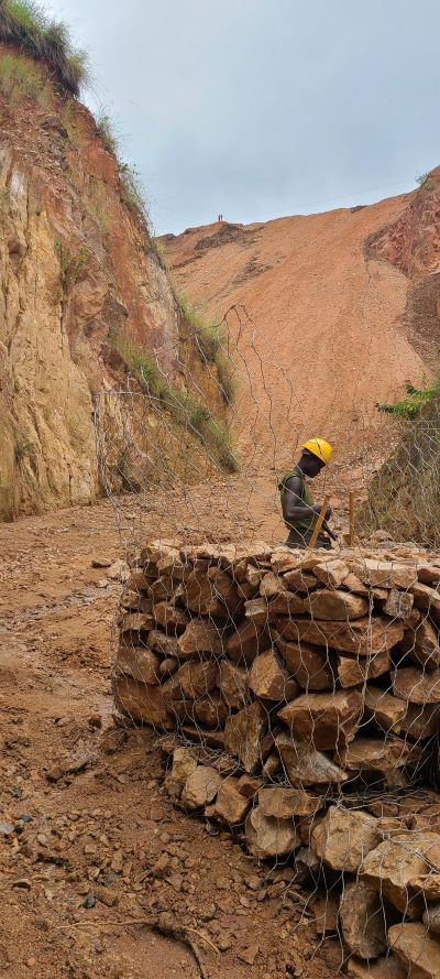 Les travaux de stabilisation du ravin par un barrage en gabions sont en cours à Kamesa sur la RN7 au PK8