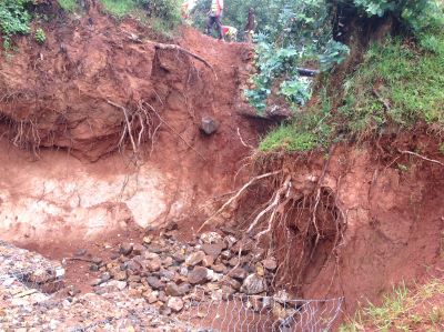 :stabilisation du pont par gabionnage, draguage de la rivière et construction du collecteur.